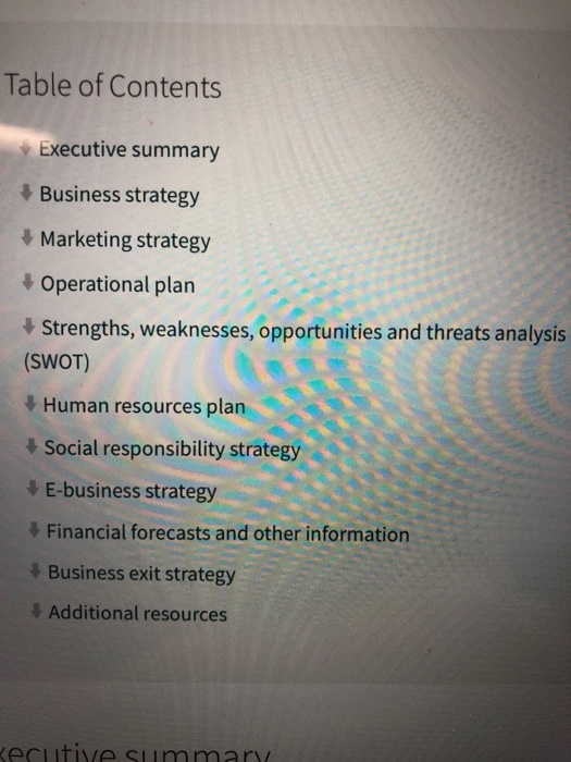 We have a lot to cover, and it's not always necessary to read through. The business plan still remains the standard for describing the business in detail. I have to write tabs for about 15 tabs for a business plan. Contents list for detailed free business plan guide with template & sample for business plan plus software for financial projections & cash flow forecasting. For new businesses, the business plan example templates give a sales forecasting table and chart to help you calculate and predict your sales. Nature of the company products or service offered by the company nature of the industry the rationale for the creation of the company the rationale for catering to a specific market. For the case where page numbers appears after heading texts, some. It is useful to see in addition, all business plans should be proofread, carefully reviewed for clarity and presented in a professional manner with a cover page, table of contents and. Looking at examples can help you. A business plan is normally a prerequisite required by banks before lending, which makes it extremely important in gaining finance. The location and the format will be determined by the publisher. It sets out where you want to go and how you want to get there. You may have more than one customer group.